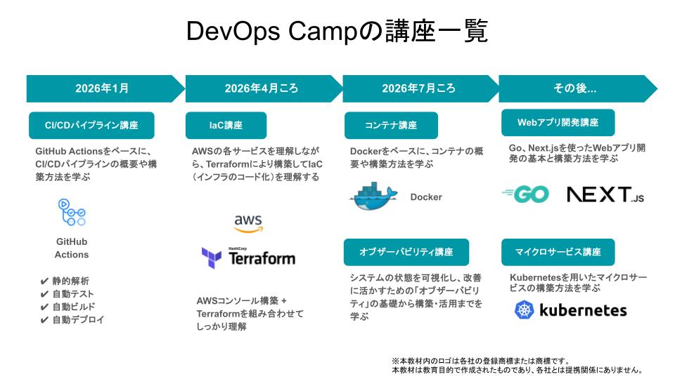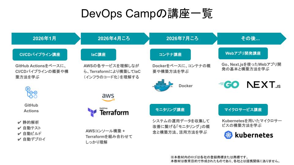 DevOps Campは「DevOps」をキーワードに、実務で活躍できる実践力を最短で身につけることを目的としたオンライン講座です。