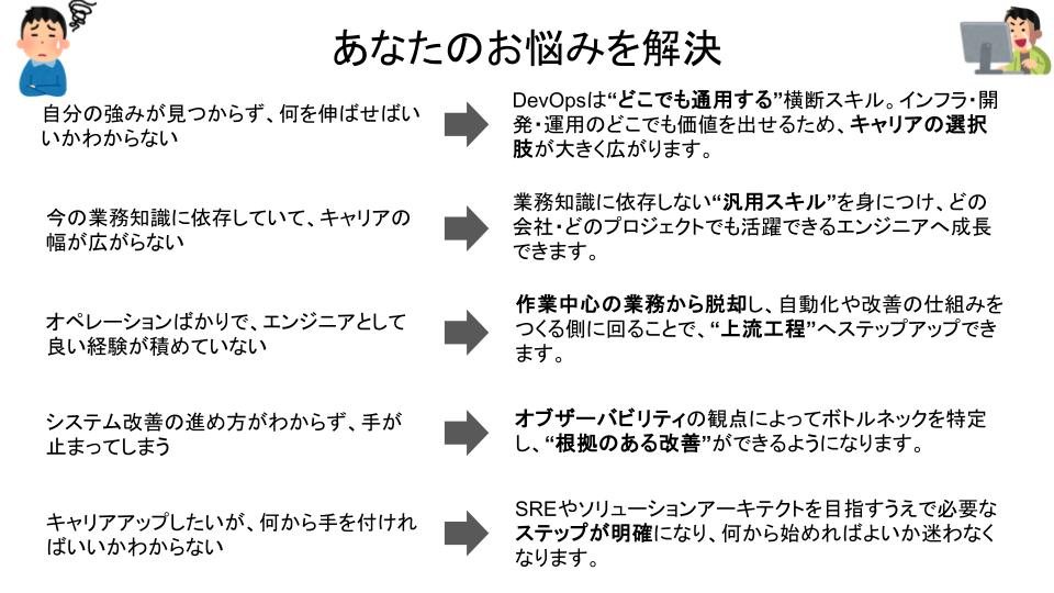 DevOpsのスキルを身につけることで、あなたのITエンジニアとしてのお悩みを解決する糸口になります!