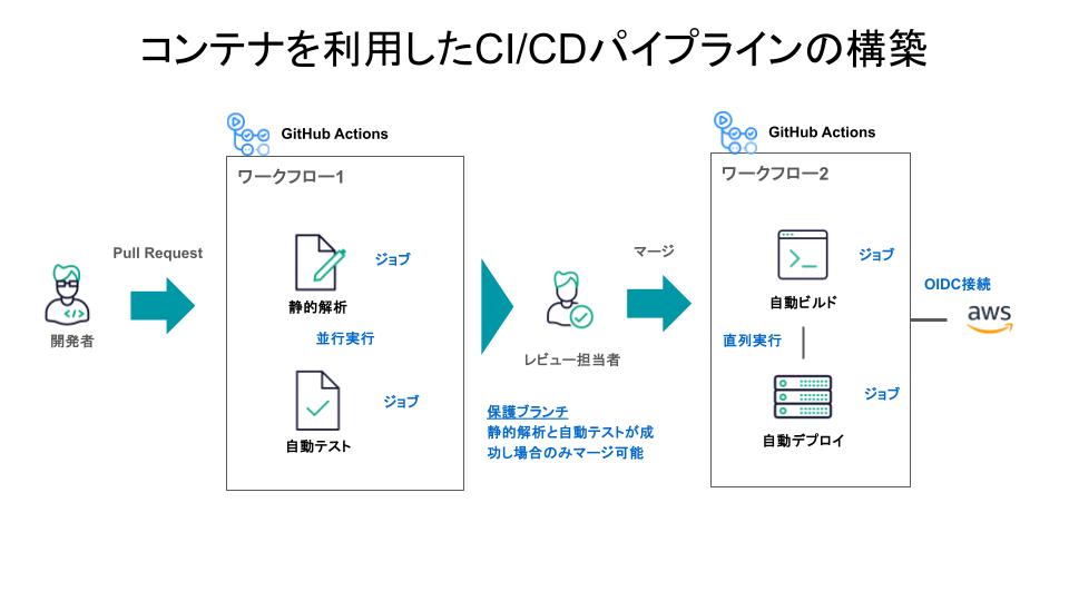 このようなCI/CDパイプラインを、GitHub Actionsを用いて構築していきます。