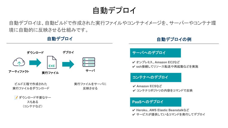 その後、レビュー担当者がコードをマージすると、コンテナイメージの自動ビルドが走り、AWSのECS/Fargateへデプロイが実行されます。