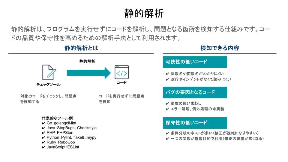 開発者がGitHubにPull Requestを発行すると、GitHub Actionsのワークフローが実行され、静的解析と自動テストが行われます。